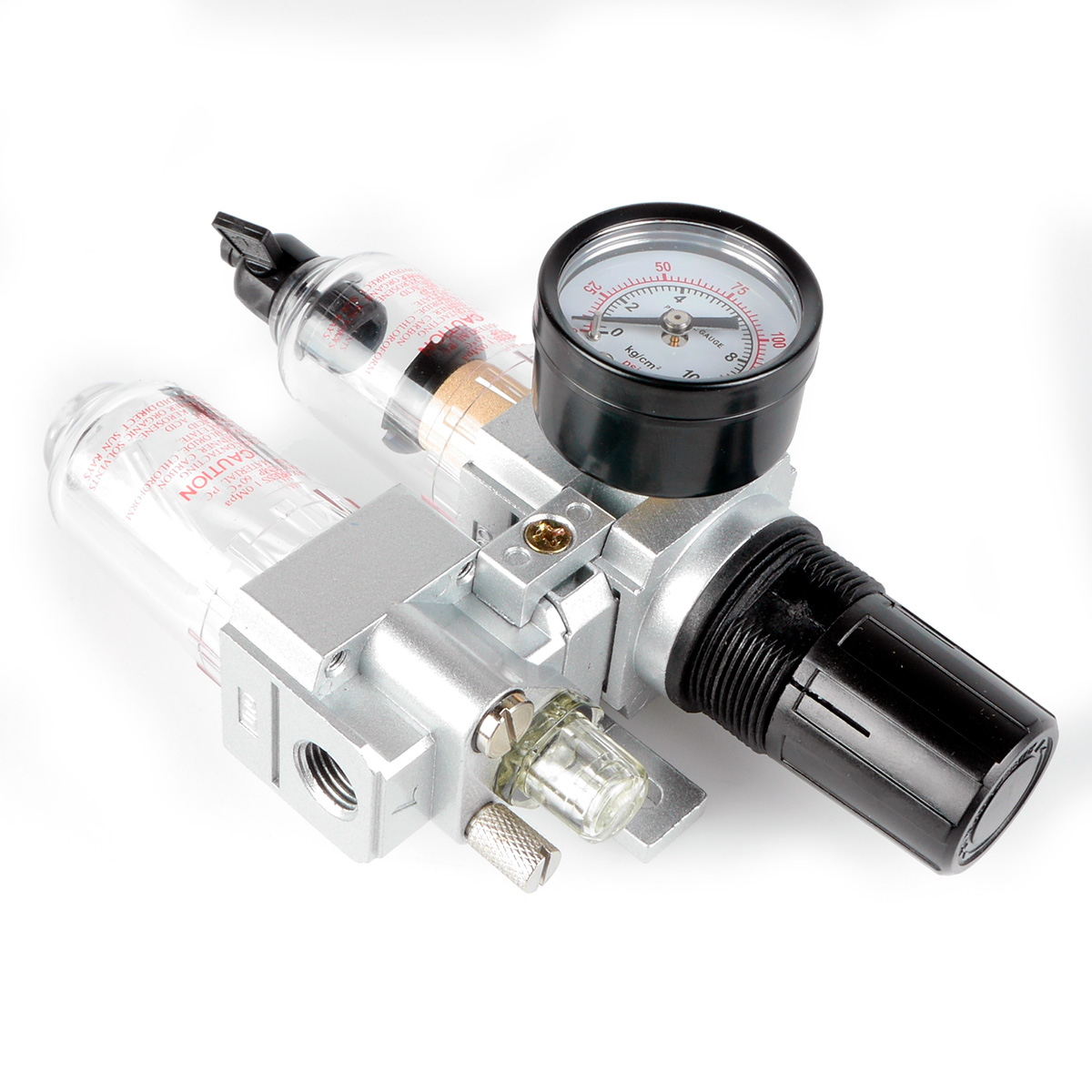 Kombineret enhed i god kvalitet med metalmanometer. Ideel til trykluftsystemer, hvor der ønskes regulering, filtrering og oliesmøring af luften.