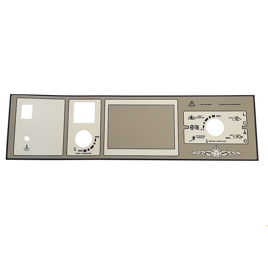 Selvklæbende label til kontrolpanelet foroven på kedlens kabinet hvor termostater, tænd/sluk knap  og termometer er monteret.