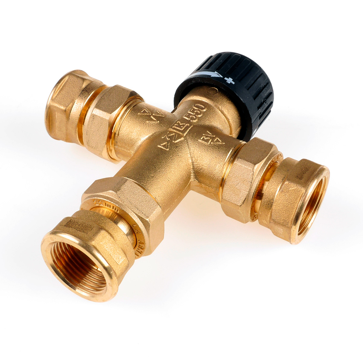 Blandeventil i messing. Anvendes til temperering af varmt brugsvand. Bruges som skoldningssikring i forbindelse med solvarmeanlæg. Blandetemperatur 30-60 grader. 3/4" indvendigt rørgevind.