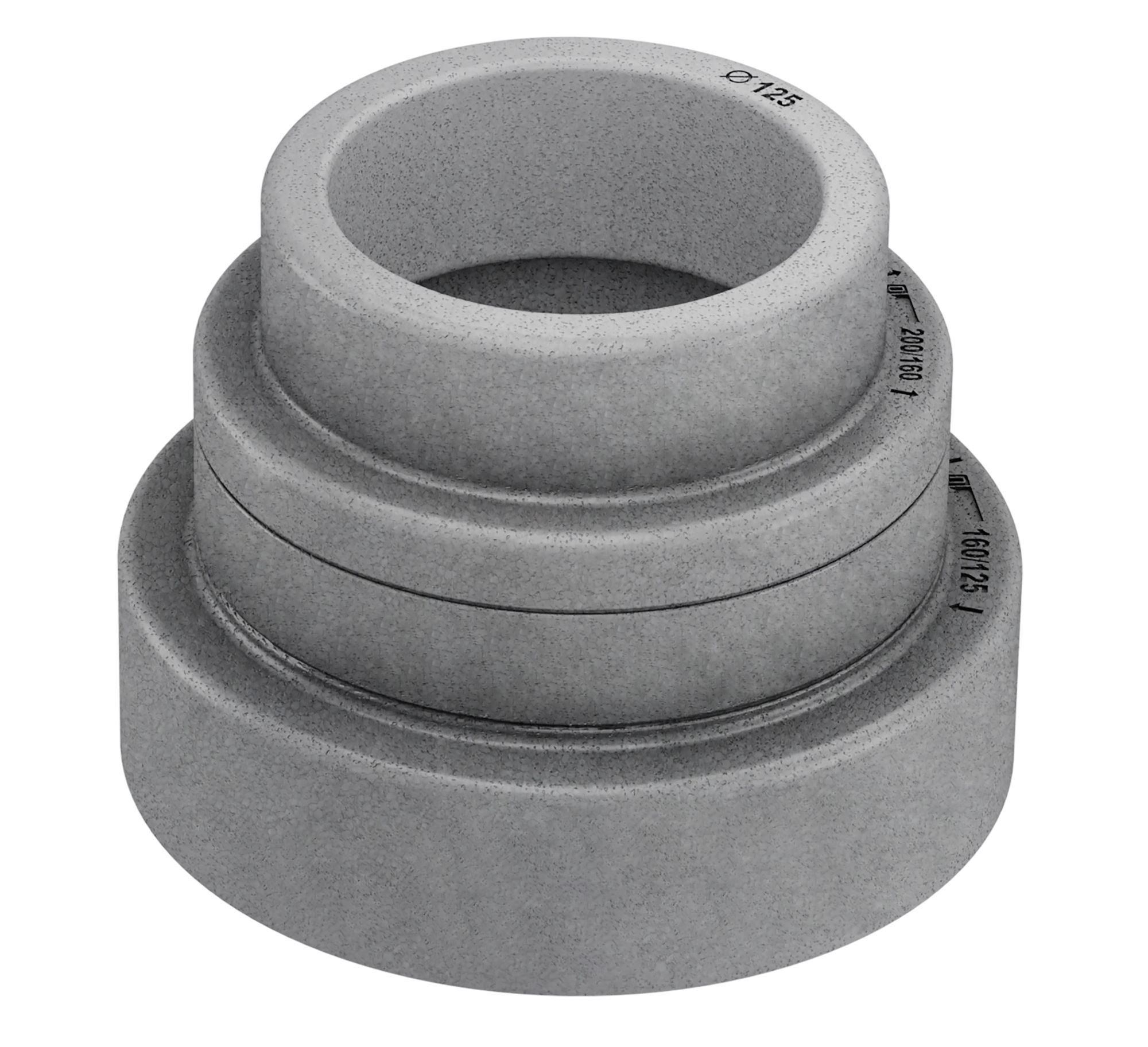 3-trinsreduktion gør det muligt at ændre rør-/kanaldiameteren mellem Ø125, Ø160 eller Ø200 mm. For at få en 2-trinsreduktion, skal delen med den ikke benyttede diameter skæres af.
