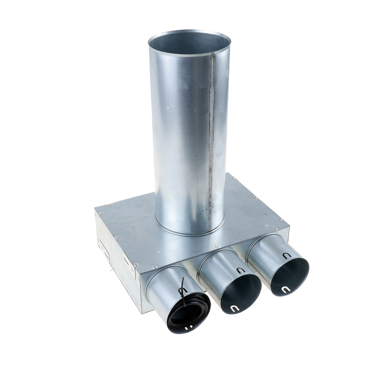 TriaAir galvaniseret fordelerboks med Ø125 mm tilslutning og 3 stk. Ø75 mm muffer, totalhøjde 420 mm. Fordelerboksen anvendes ved montering af ventiler.