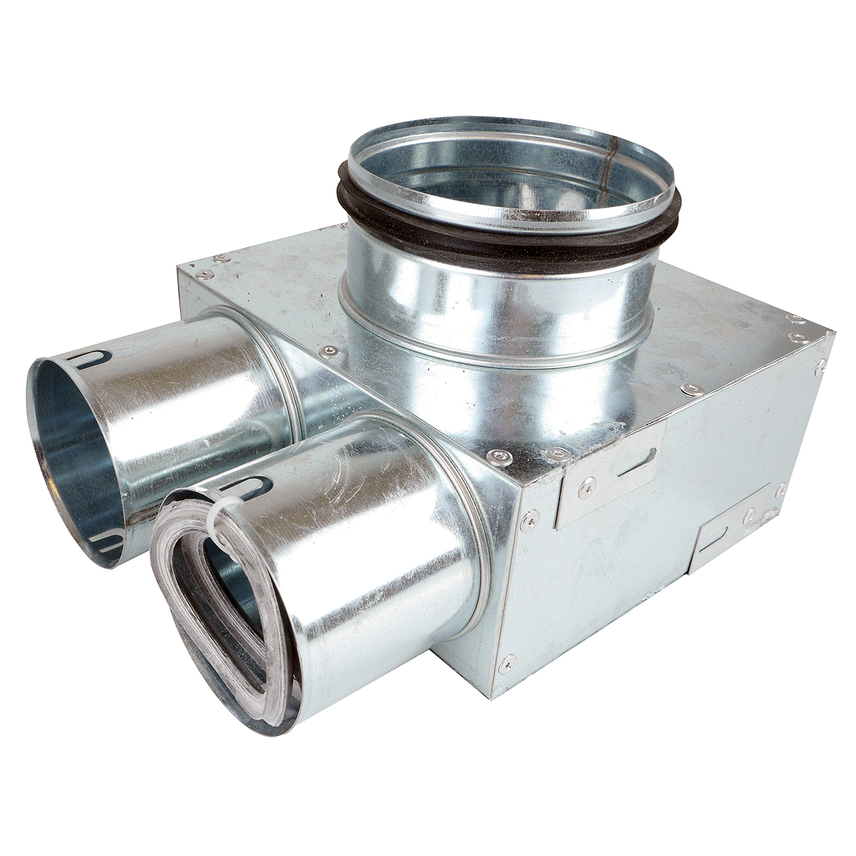 TriaAir galvaniseret fordelerboks med Ø125 mm nippel og 2 stk. Ø75 mm muffer. Anvendes til gulv- og operatørrumsmontage.