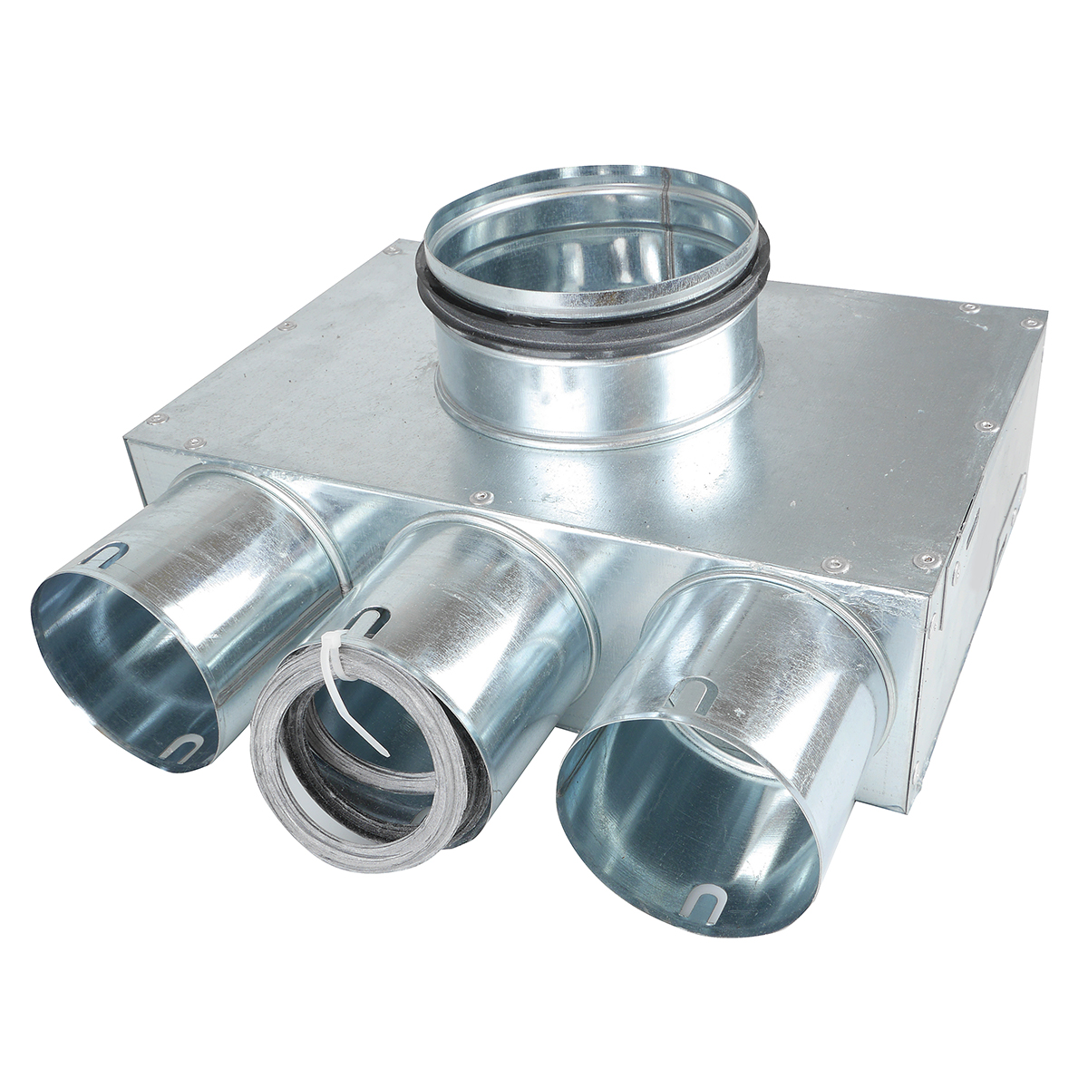 TriaAir galvaniseret fordelerboks med Ø125 mm nippel og 3 stk. Ø75 mm muffer. Fordelerboksen anvendes til gulv- og operatørrumsmontage.