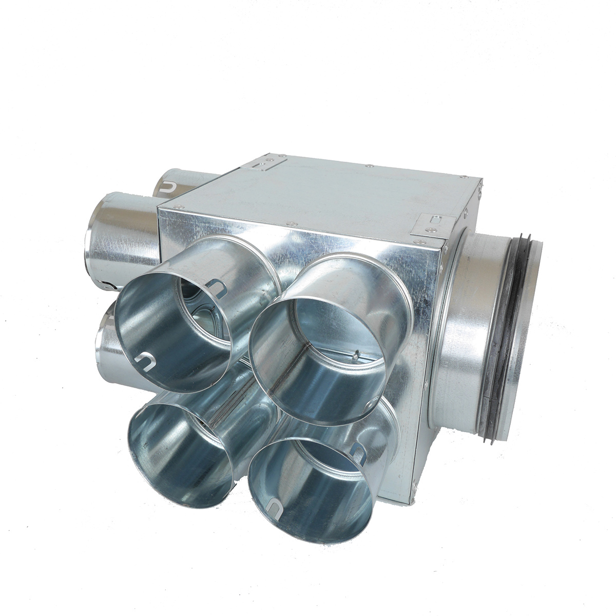 TriaAir galvaniseret fordelerboks med Ø160 mm nippel i siden og 8 stk. Ø75 mm muffer. Fordelerboksen anvendes primært til loftmontage.