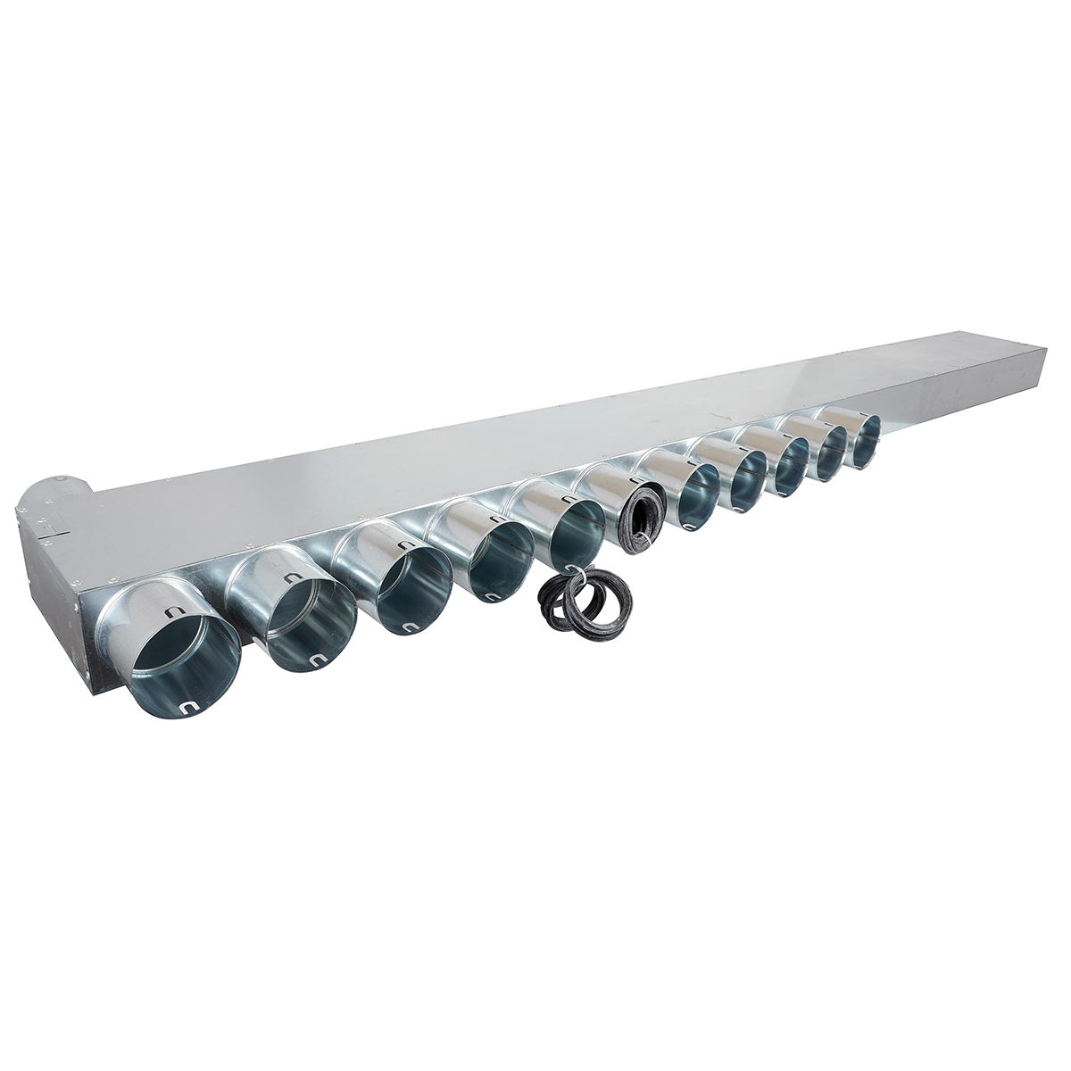 TriaAir galvaniseret fordelerboks uden nipler og med 12 stk. (11x1) Ø75 mm muffer. Fordelerboksen anvendes til gulv- og operatørrumsmontage.