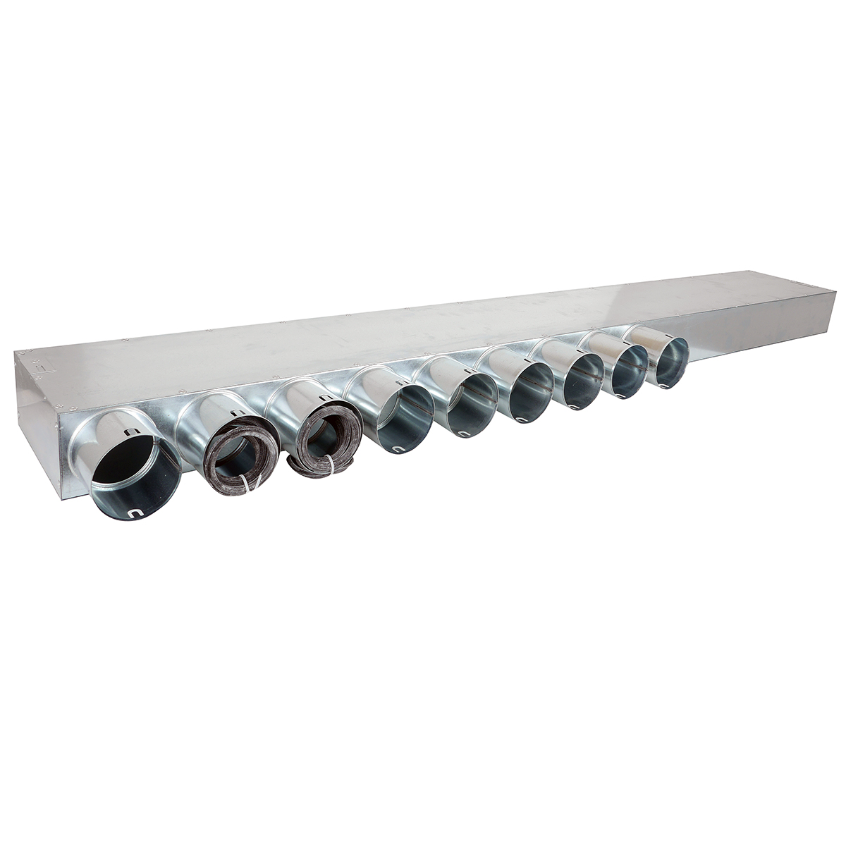 TriaAir galvaniseret fordelerboks u/nippel og med 9 stk. Ø75 mm muffer. Fordelerboksen anvendes til gulv- og operatørrumsmontage.